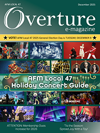 For special members-only Overture content — Executive Board minutes, CBAs, Local 47 Wage Scales, Bylaws, Suspended/Expelled member lists, and more — log in to your new E2 member account at ensemble.afm47.org and browse the “Overture” section on the Documents page. (New to E2? Visit our E2 FAQ here.)
