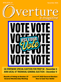 For special members-only Overture content — Executive Board minutes, CBAs, Local 47 Wage Scales, Bylaws, Suspended/Expelled member lists, and more — log in to your new E2 member account at ensemble.afm47.org and browse the “Overture” section on the Documents page. (New to E2? Visit our E2 FAQ here.)