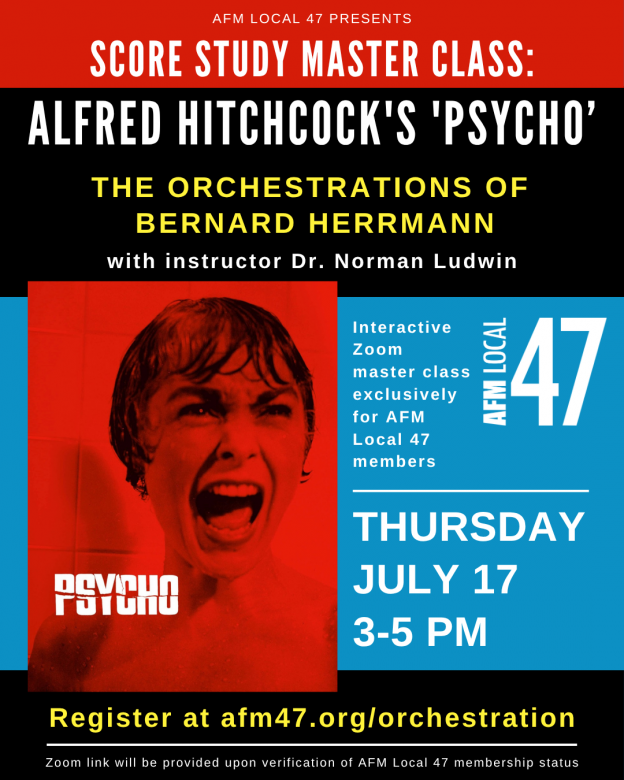 AFM Local 47 is pleased to present a score study master class on Alfred Hitchcock’s ‘Psycho’: the Orchestrations of Bernard Herrmann with Instructor Dr. Norman Ludwin, exclusively for AFM Local 47 members.