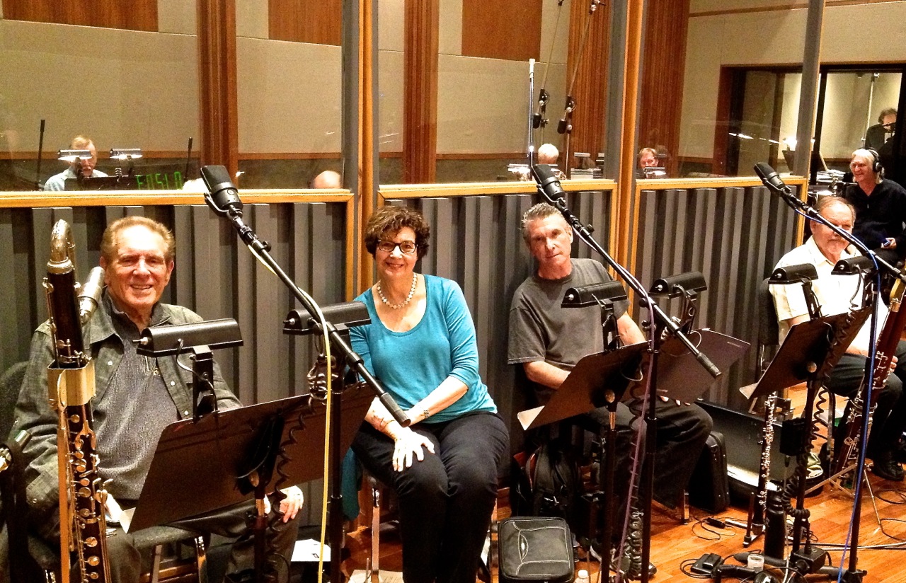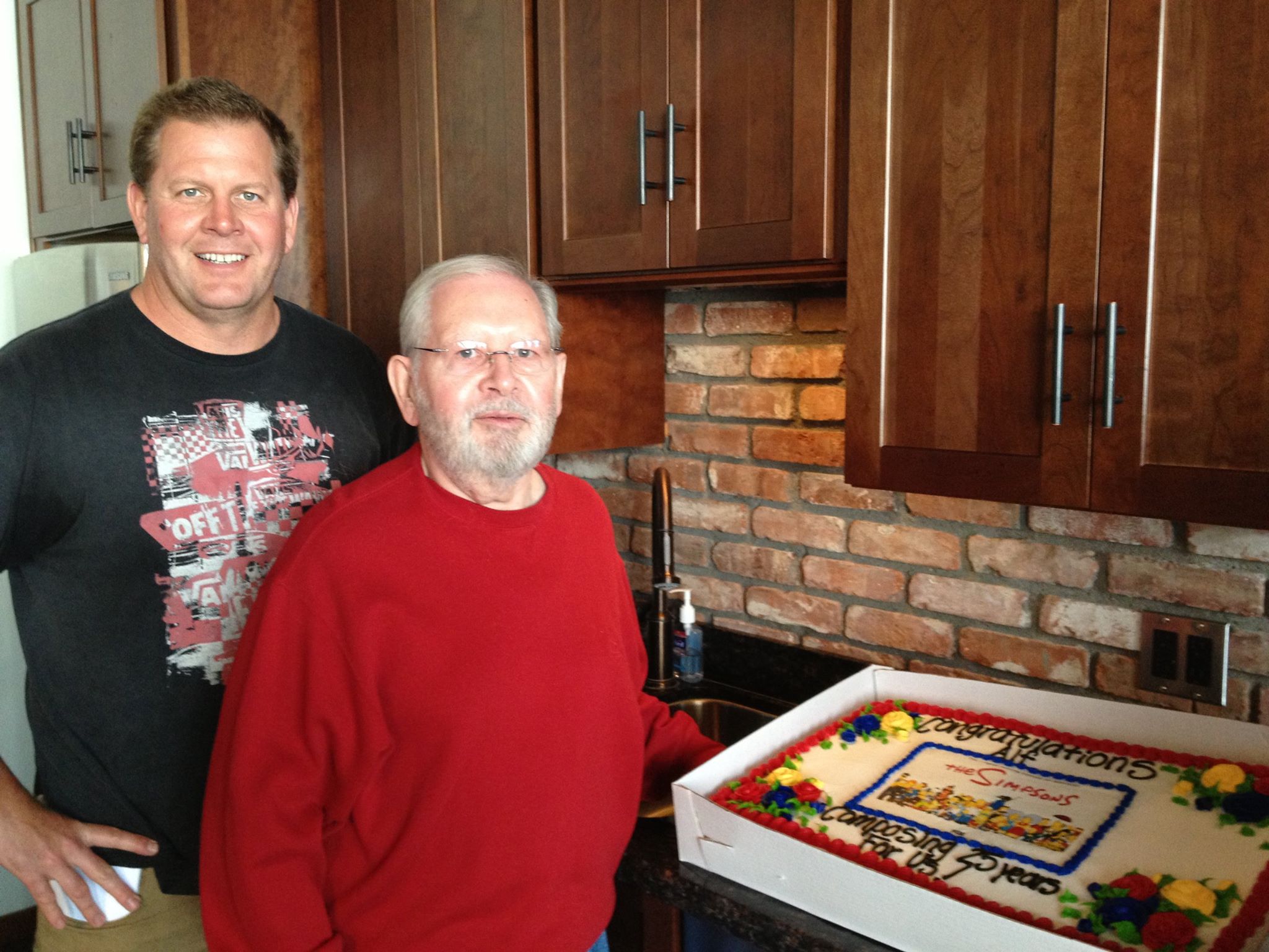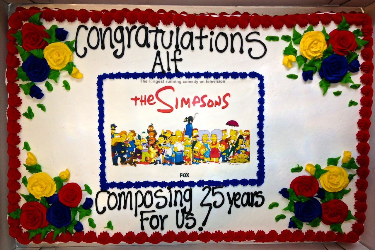 At the Bridge Recording on May 9, “Simpsons” orchestra musicians surprised composer Alf Clausen with a cake to celebrate his 25 years writing music for the series. Photos by Gayle Levant.