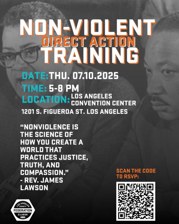 We are now being called to practice this science. Join the LA Fed as we train with fellow labor members and activists at a Direct Action Training on Thursday, July 10, 2025, 5-8 p.m. at the L.A. Convention Center, 1201 S. Figueroa St.