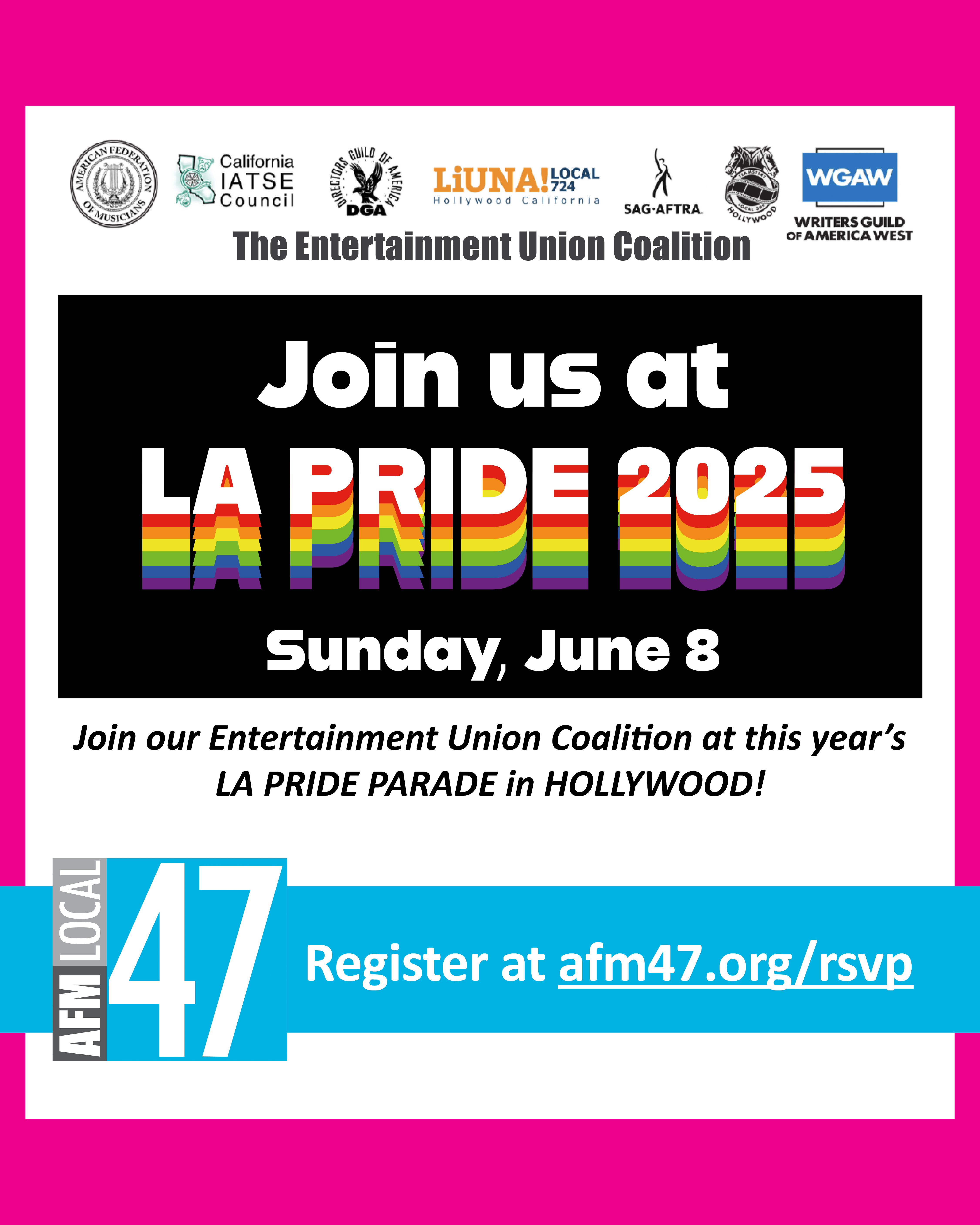 This year, we are marching to show our PRIDE and support of our LGBTQ+ community, and to raise awareness of our ongoing fight to protect and grow film and television jobs in our state through our Keep California Rolling campaign and the fight to expand and modernize our film and television jobs program. AFM will be marching alongside Teamsters, SAG-AFTRA, DGA, IATSE, WGA-W and more.