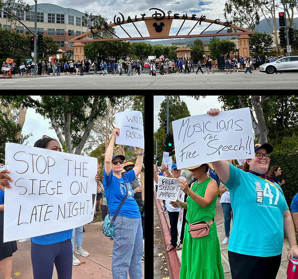 The day following the suspenion announcement, WGA West hosted a large rally attended by hundreds of entertainment union members, including writers, musicians, actors and stagehands, outside of Walt Disney Studios in Burbank (ABC is owned by the Walt Disney Company). The AFM joined fellow entertainment unions SAG-AFTRA, DGA and IATSE in a joint statement, calling the move “part of a disturbing trend of increasing interference in creative expression” and stating that “all broadcasters must stand firm in defense of free expression and the First Amendment, not capitulate to a policy of political appeasement.”